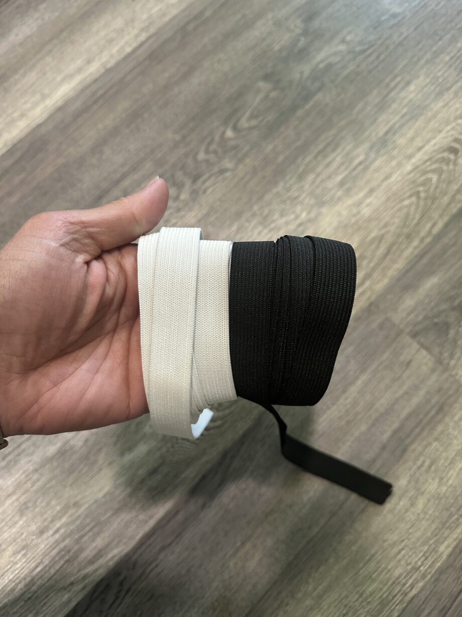 This type of elastic is ideal for waistbands because it maintains its width when stretched, ensuring a consistent fit and appearance. Can be used in a casing application or for sewing directly through it (like we do in the Jalie Sylvie shorts/pants).